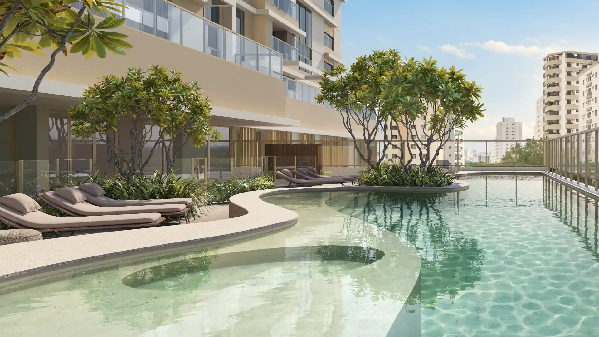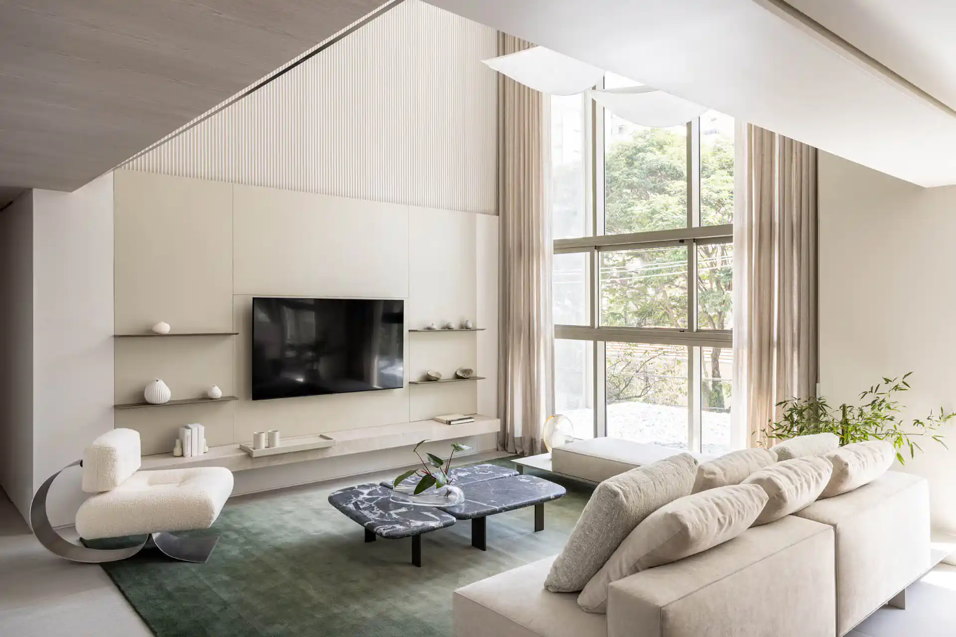 A arquitetura privilegia a entrada de luz natural através de imensas janelas do chão ao teto, criando ambientes que são verdadeiros oásis de claridade e bem-estar.